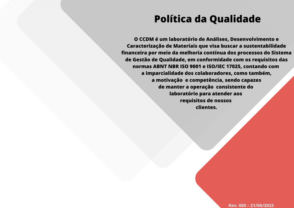 O CCDM é um laboratório de Análises, Desenvolvimento e Caracterização de Materiais que visa buscar a sustentabilidade financeira por meio da melhoria contínua dos processos do Sistema de Gestão de Qualidade, em conformidade com os requisitos das normas ABNT NBR ISO 9001 e ISO/IEC 17025, contando com a imparcialidade dos colaboradores, como também, a motivação e competência, sendo capazes de manter a operação consistente do laboratório para atender aos requisitos de nossos clientes.